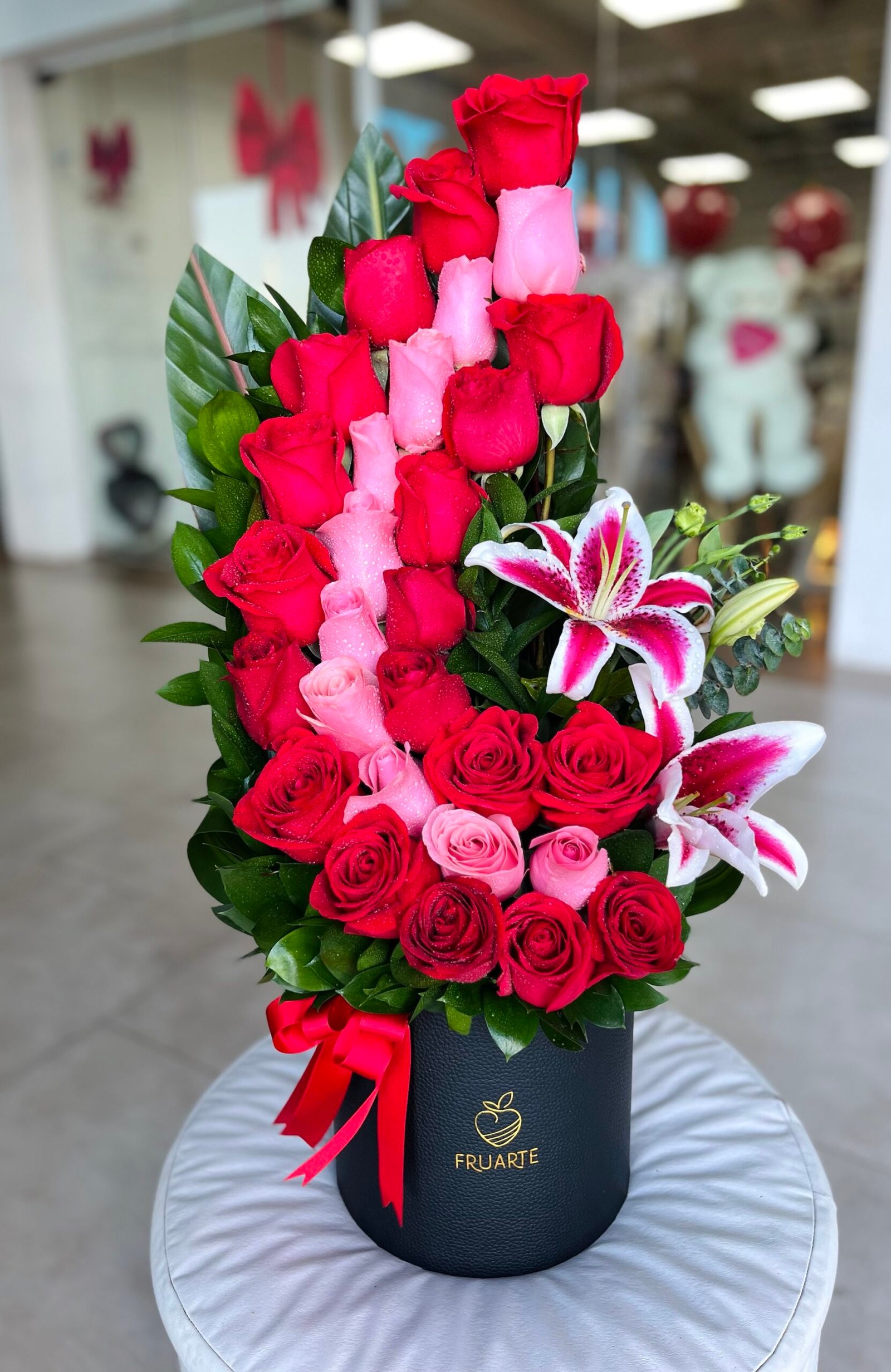 Arreglo de corazones doble con 34 rosas , base “jardin” de rosas y lirios + 2 globos con helio personalizables