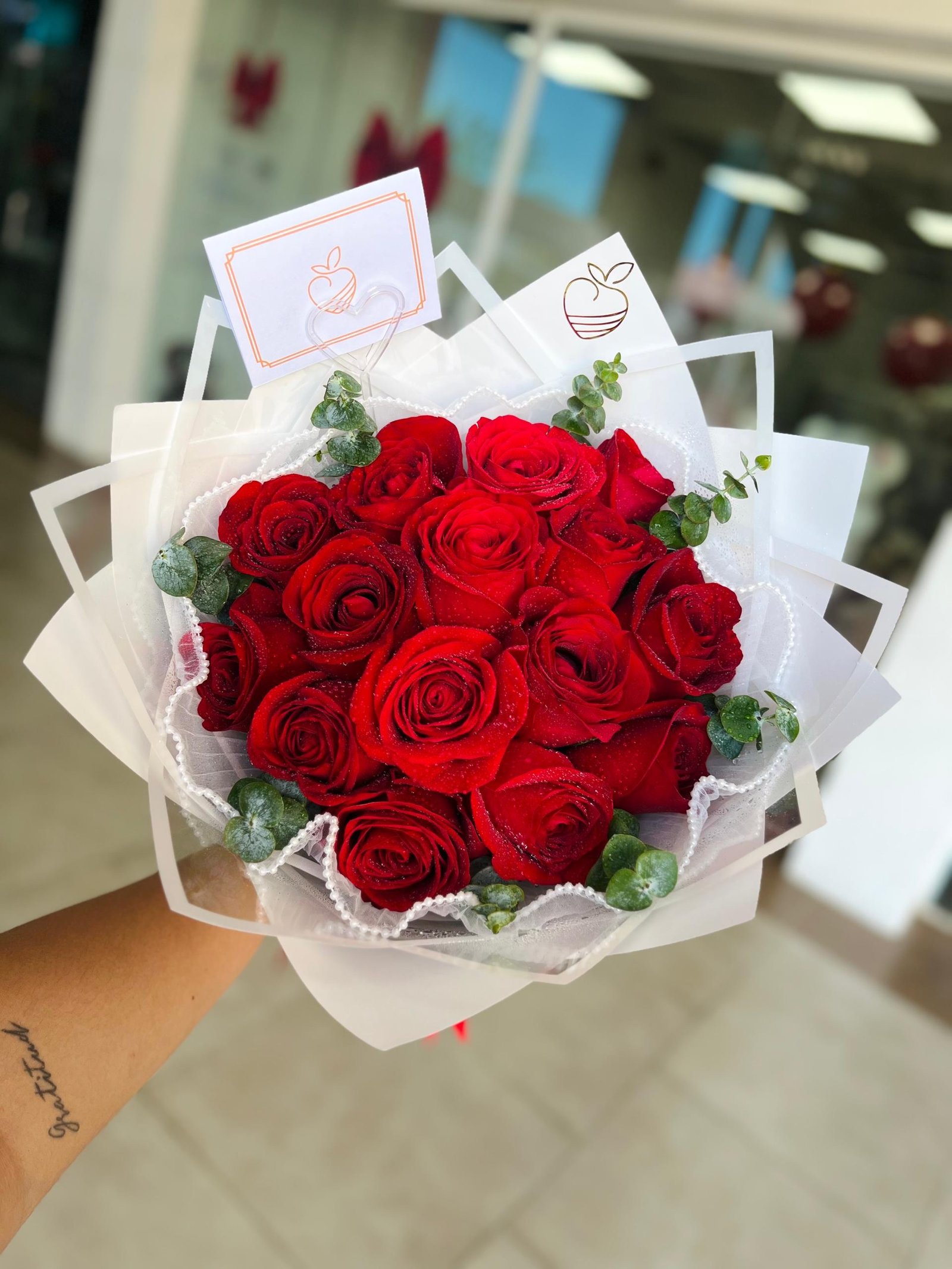 Rosas rojas, rosadas o variadas a elección según disponibilidad, eucalipto, y follaje en forma casi redonda.